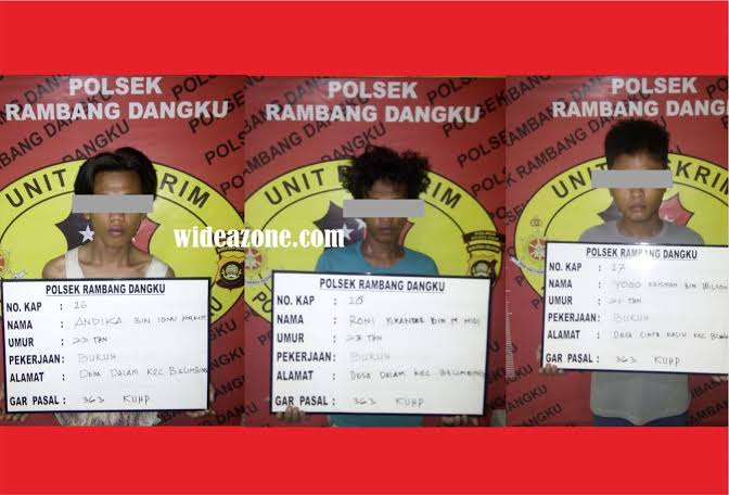 Kapolres Muaraenim AKBP Afner Juwono melalui Kapolsek Rambang Dangku AKP Apriansyah SH membenarkan telah menangkap 3 tersangka, yaitu Andika (23) warga Desa Dalam kecamatan Belimbing ,Yogo Kerismon warga Desa Cinta Kasih Kecamatan Belimbing (21) dan Roni Iskandar (23) warga Desa Dalam Kecamatan Belimbing,”ujar Kapolsek Rambang Dangku kepada Jurnalis wideazone.com