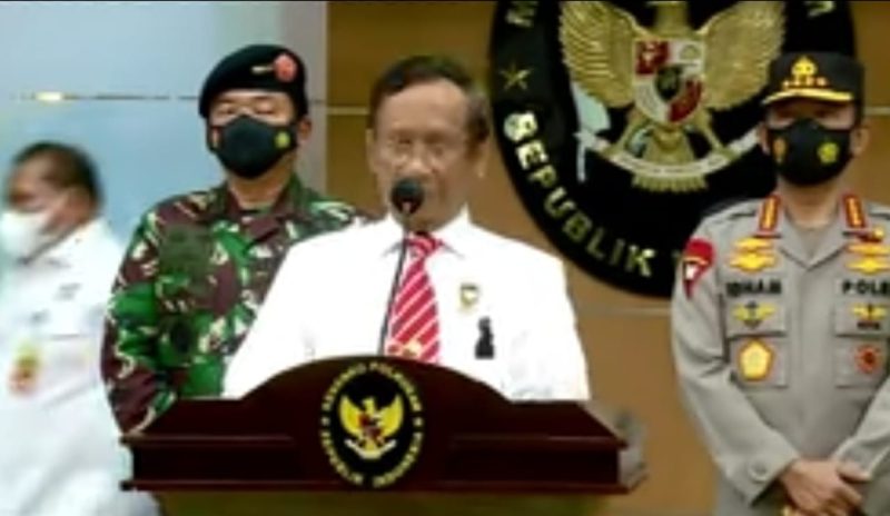 Dalam Konferensi Persnya, Menkopolhukam didampingi sejumlah petinggi lembaga negara, Panglima TNI Marsekal Hadi Tjahjanto, Kapolri Jenderal Idham Azis, Kepala BIN Budi Gunawan, Menkum HAM Yasonna Laoly, Mendagri Tito Karnavian, Kepala KSP Moeldoko, Menkominfo Johnny G Plate, Jaksa Agung ST Burhanuddin, Kepala BNPT Komjen Boy Rafli Amar, dan Kepala PPATK.